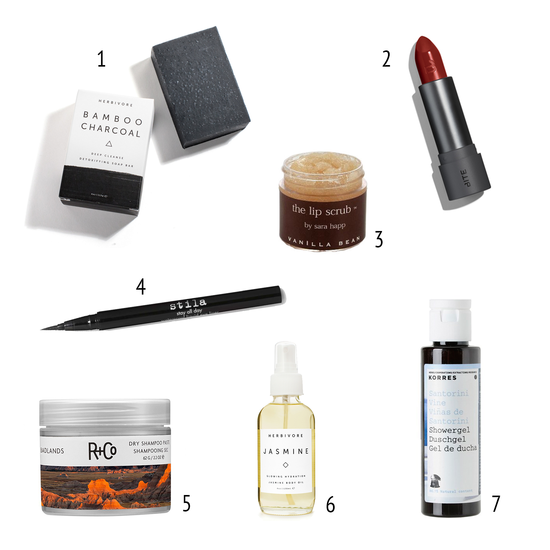 1: Bamboo charcoal soap - $12 at Roam in Jackson Hole, WY or Herbivore. 2: Bite Beauty "Amuse bouche" lipstick - $26 on Sephora.com 3: Sara Happ "Brown Sugar" lip scrub- $24 at Sarahapp.com 4: Stila "Stay-all-day" liquid eyeliner - $22 on Sephora.com 5: R+Co "BADLANDS" dry shampoo and hair paste - $28 at R+CO.com or Frost Salon, in Jackson Hole WY 6: Jasmine body oil - $26 available on Herbivore 7: KORRES "Santorini vine" body wash - $11 on feelunique / Descriptions of my favorite beauty picks, below!